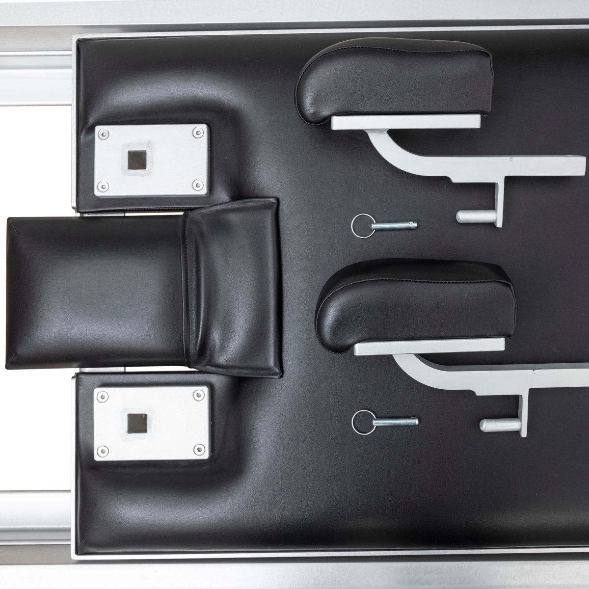 Reformer with tower designed in a compact anodized aluminum reinforced structure of great resistance. With long lasting leather upholstered bed filled with very comfortable high density EVA foam. Fully functional and versatile, it allows to perform a wide variety of exercises with total precision, comfort and safety. Ideal for personal or professional studios that want a unique Pilates experience.